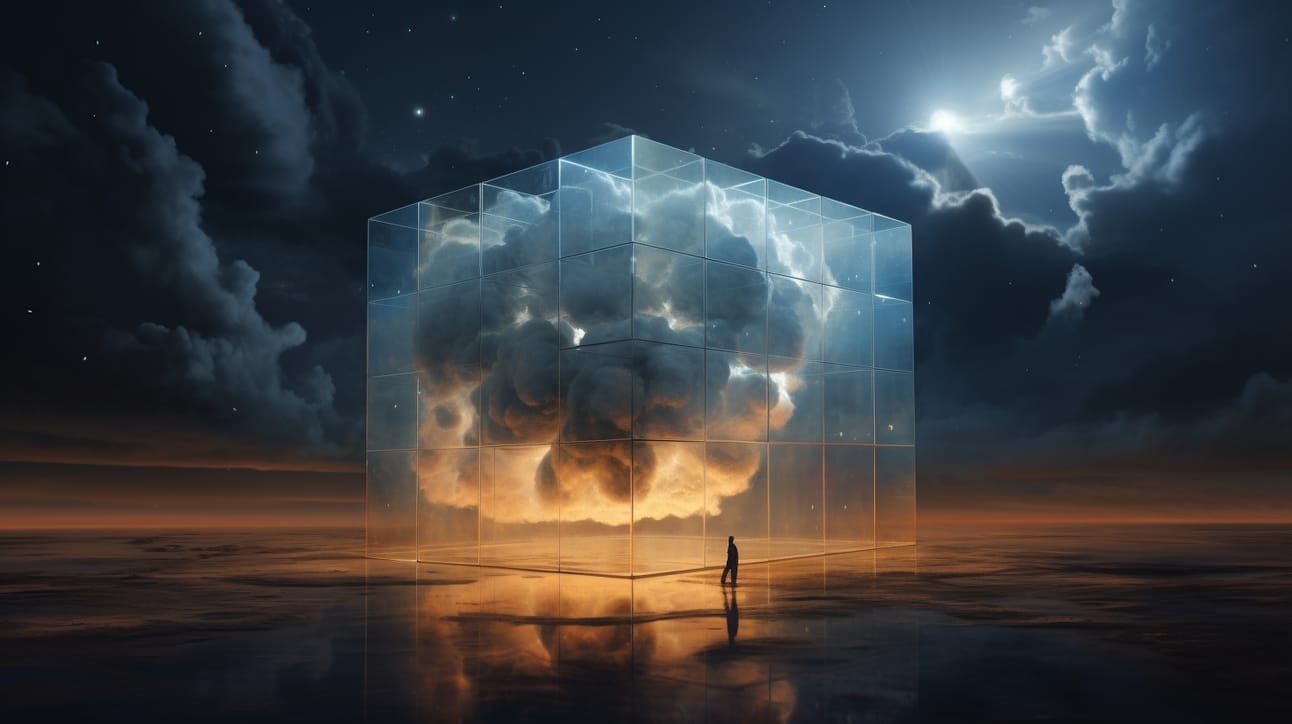 PROMPT: Bosch-style , a translucent cube traps eerie clouds, the starsscape warps, time distorts, surrealism reigns,stars,Glowing,sparkling. --ar 16:9