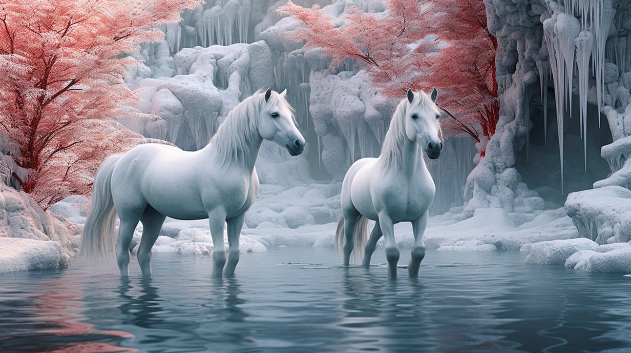 PROMPT: Two horses standing in the water near waterfall, in the style of frozen movement, chilling creatures, i can't believe how beautiful this is, animated gifs, gravity-defying landscapes, white and crimson, characterized animals --ar 16:9