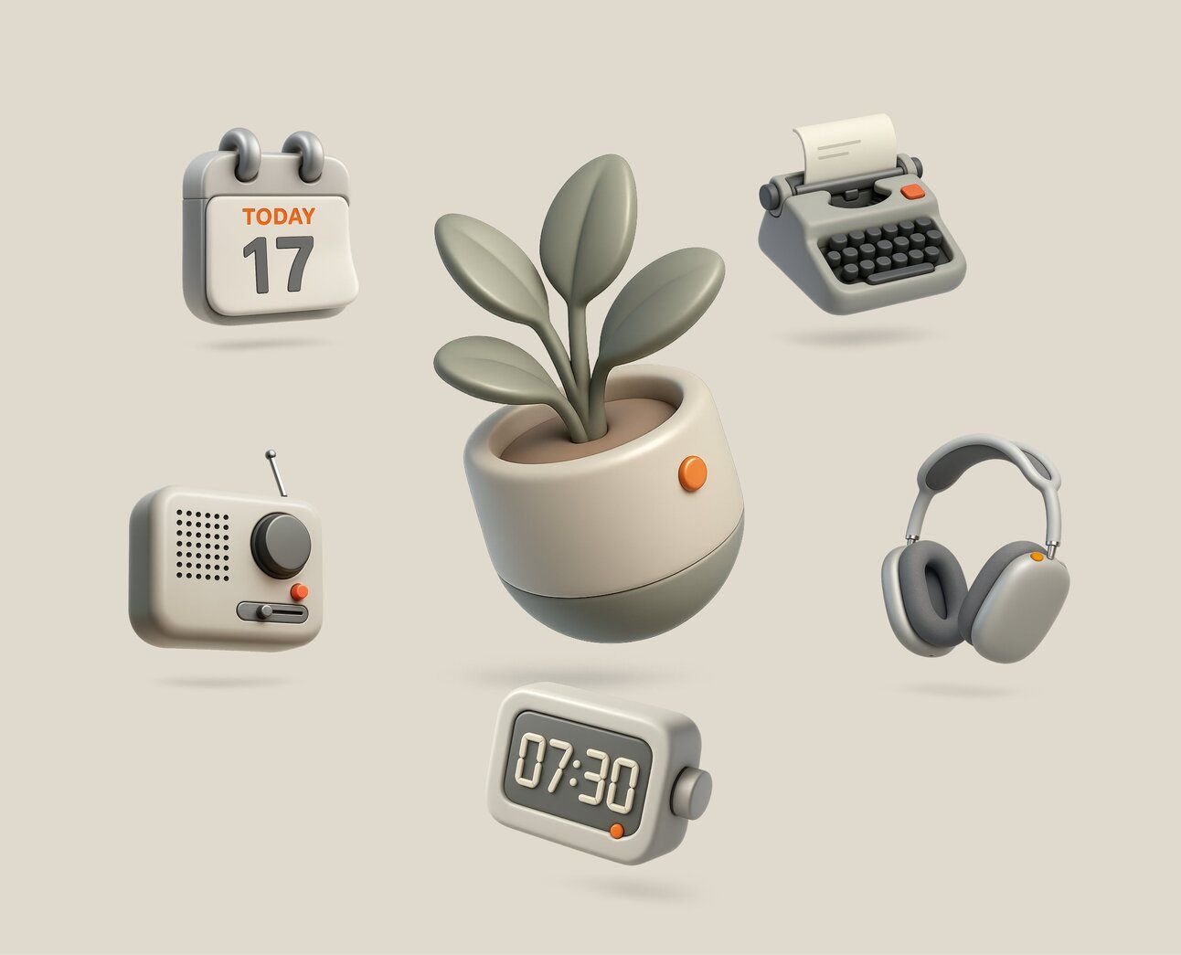 Prompt: Ilustración 3D minimalista de [objeto], sombras suaves, texturas plásticas lisas, colores pastel apagados como beige, gris y verde oliva. Iluminación suave. Vista isométrica con perspectiva sutil, estilo tierno y amigable, renderizado digital moderno.