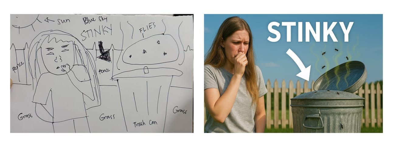 Prompt: Convierte este boceto en una miniatura hiperrealista para YouTube con una resolución de 1920×1080 px. El único texto que debe aparecer es “STINKY” y una flecha apuntando al basurero. Todo lo demás son instrucciones con detalles que debés seguir.