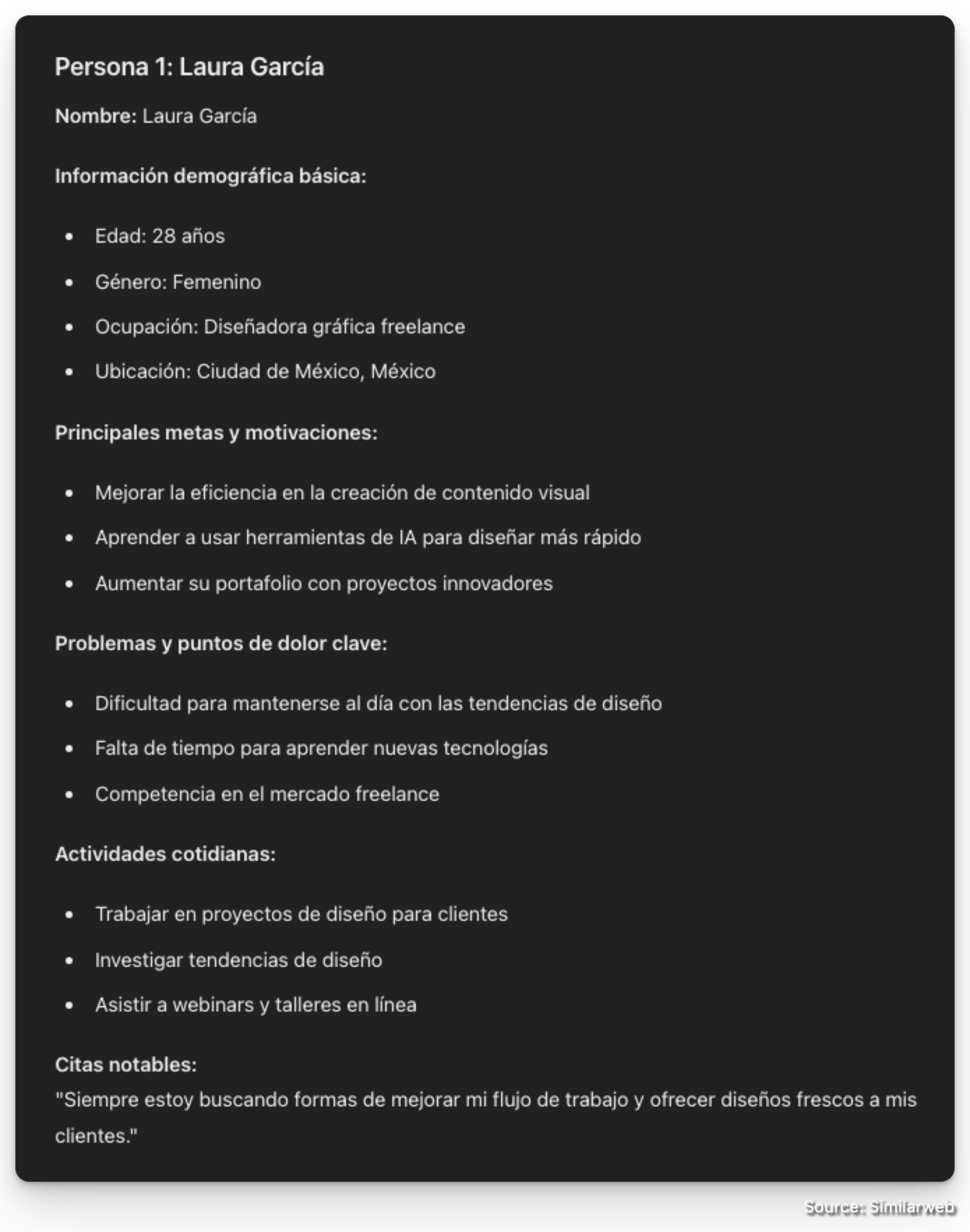 Este prompt simulará una ronda de entrevistas con usuarios y resumirá los resultados en forma de “User Persona”. Las personas nos permiten agrupar a nuestra audiencia en segmentos para entender los diferentes tipos de usuarios, personificarlos para ponernos en sus zapatos, y hacer un marketing más dirigido.