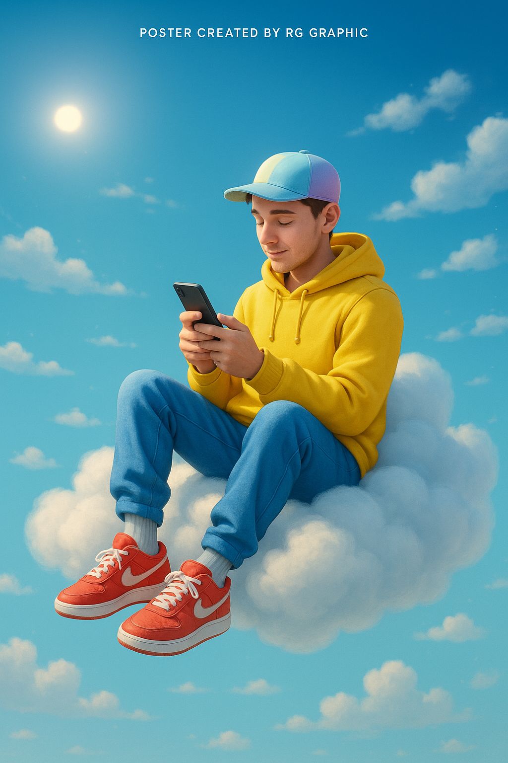 Prompt: A surreal digital artwork of a young man sitting comfortably on a fluffy white cloud high in the sky, wearing a yellow hoodie, blue joggers, red and white sneakers, and a pastel-colored cap. He is looking at his smartphone with a relaxed expression. The sky is bright blue with soft sunlight and scattered white clouds around him, creating a dreamy, peaceful vibe. The lighting is soft and natural, with slight glow effects on the clouds. The scene has a clean, modern, and slightly cartoonish or 3D-rendered look, like a polished digital poster or concept art. Text at the top reads “Poster created by RG Graphic.”