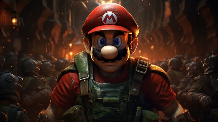 PROMPT: Mario bros super mario army, in the style of aleksi briclot, selective focus, close-up --ar 16:9
